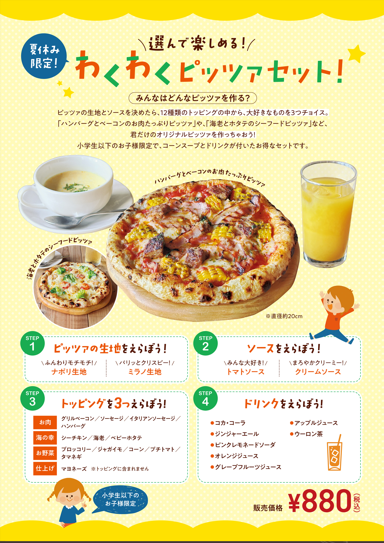 7月28日(月)から8月24日(日)までの期間限定で、小学生以下のお子様向けの特別メニュー「わくわくピッツァセット」がランチタイムに登場!